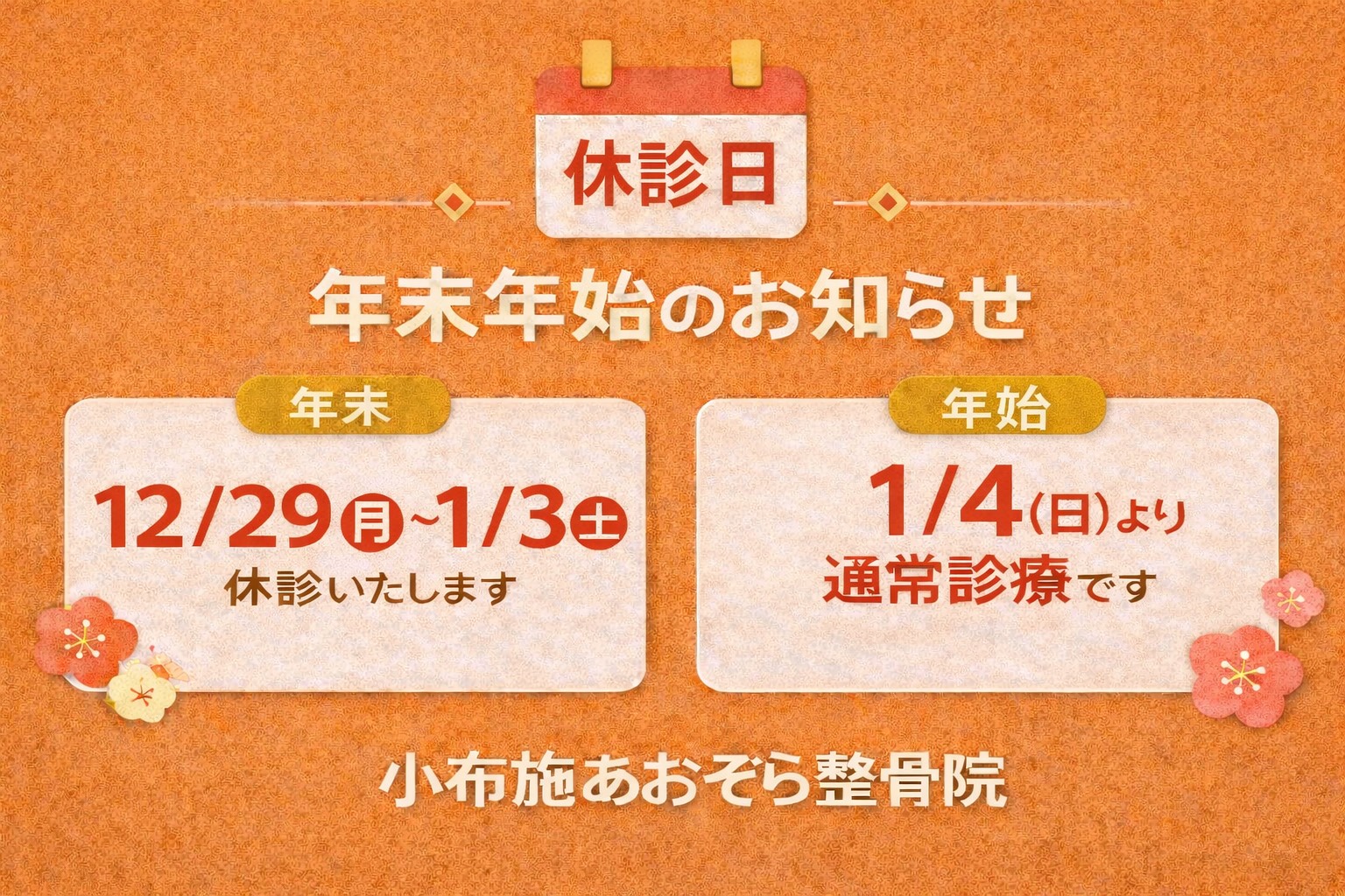 年末年始の診療スケジュールについて、下記の通りご案内いたします。